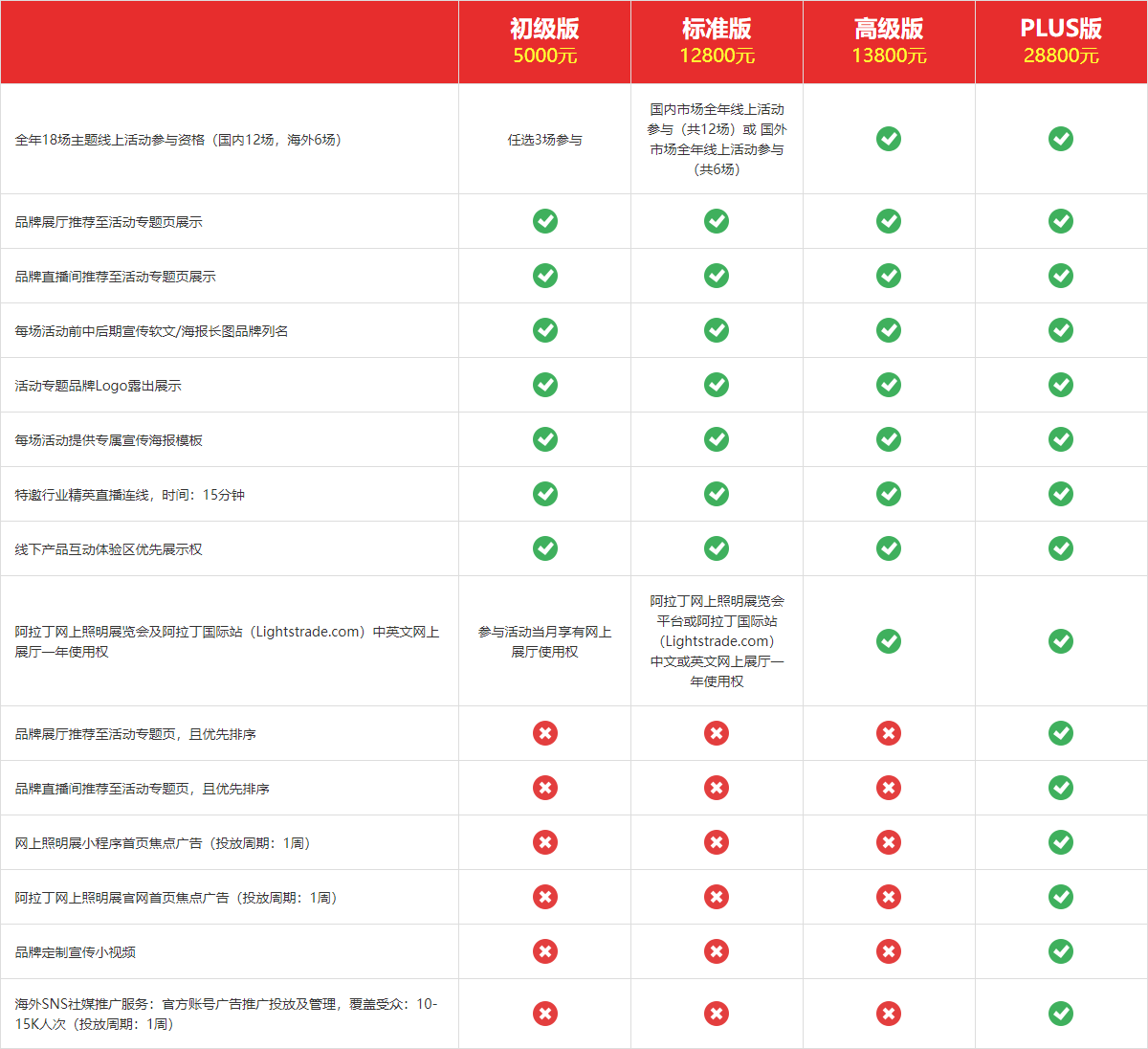| 阿拉丁網(wǎng)上照明展覽會(huì)及阿拉丁國際站(Lightstrade.com)中英文網(wǎng)上展廳一年使用權(quán) | 參與活動(dòng)當(dāng)月享有網(wǎng)上展廳使用權(quán) | 阿拉丁網(wǎng)上照明展覽會(huì)平臺(tái)或阿拉丁國際站(Lightstrade.com)中文或英文網(wǎng)上展廳一年使用權(quán) |